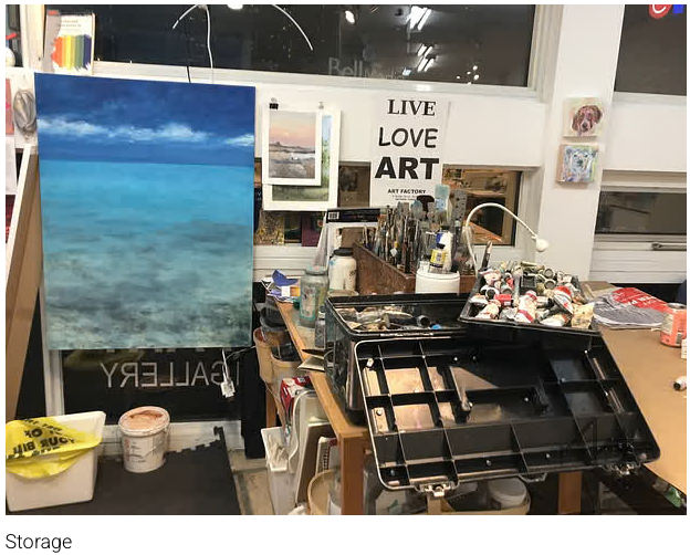 In 2014, when I was between jobs, I decided to rent some space in downtown Toronto. It took a while to get the 10x 13-foot studio organized and to feel comfortable working on my own, especially without an instructor providing guidance. I have since reorganized and moved spaces to suit my needs; I added a wall and attached hanging rails to hold the canvases. I repurposed a box that my dad made to hold some of his toolmaking dies into a brush and paint knife holder. True to my (and perhaps his) nature I have stuffed the furniture with paints, cleaning rags, articles I will read someday and canvases, plus a supply of emergency snacks and tools.