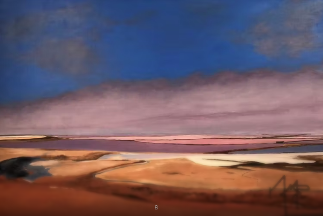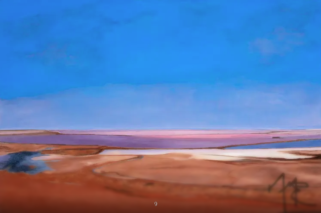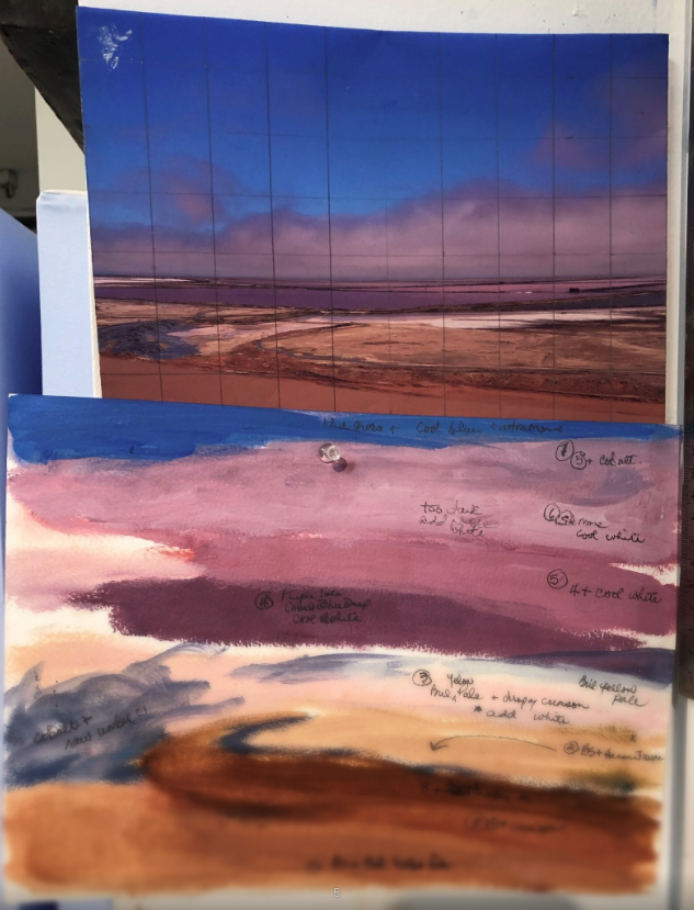 To create the colours for the two Salt Lakes paintings, I developed a sample board (photo 5) where I could record how I made them, and make sure they were consistent with my source photo. I also lowered the intensity of the pink cloud above the horizon (photos 8 and 9) as I felt it was taking away from the salt lakes.