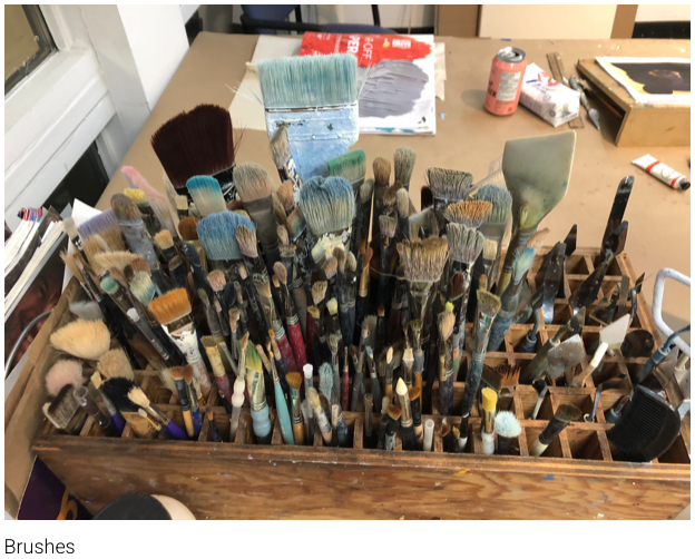 In 2014, when I was between jobs, I decided to rent some space in downtown Toronto. It took a while to get the 10x 13-foot studio organized and to feel comfortable working on my own, especially without an instructor providing guidance. I have since reorganized and moved spaces to suit my needs; I added a wall and attached hanging rails to hold the canvases. I repurposed a box that my dad made to hold some of his toolmaking dies into a brush and paint knife holder. True to my (and perhaps his) nature I have stuffed the furniture with paints, cleaning rags, articles I will read someday and canvases, plus a supply of emergency snacks and tools.